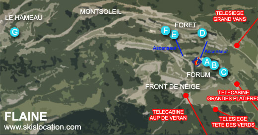 plan de flaine carte de la station de ski du Grand Massif Plan de Flaine : Flaine Front de Neige (1500 m), Flaine Forum (1600 m), Flaine Montsoleil (1750 m) et le Hameau de Flaine (1800 m)